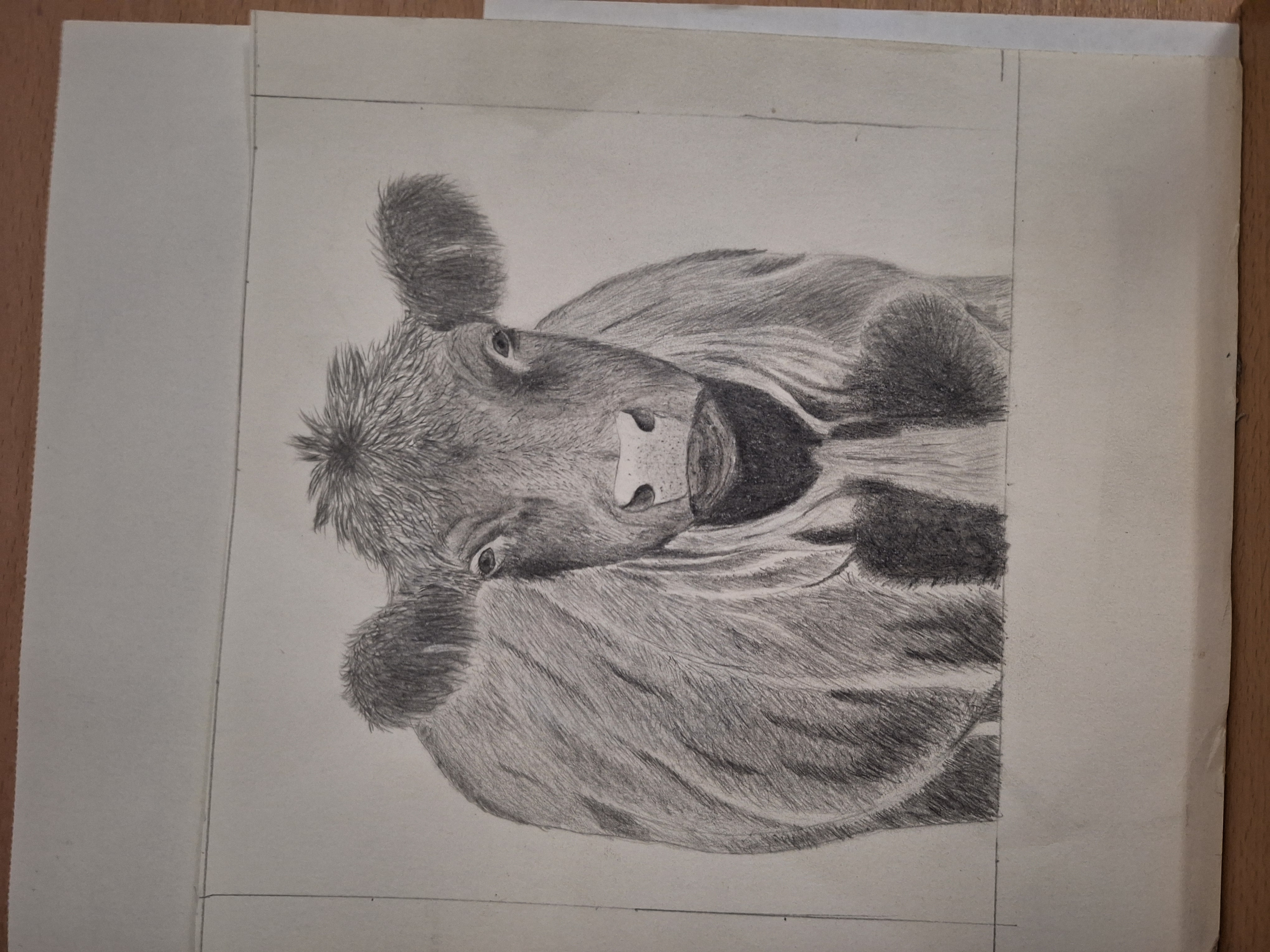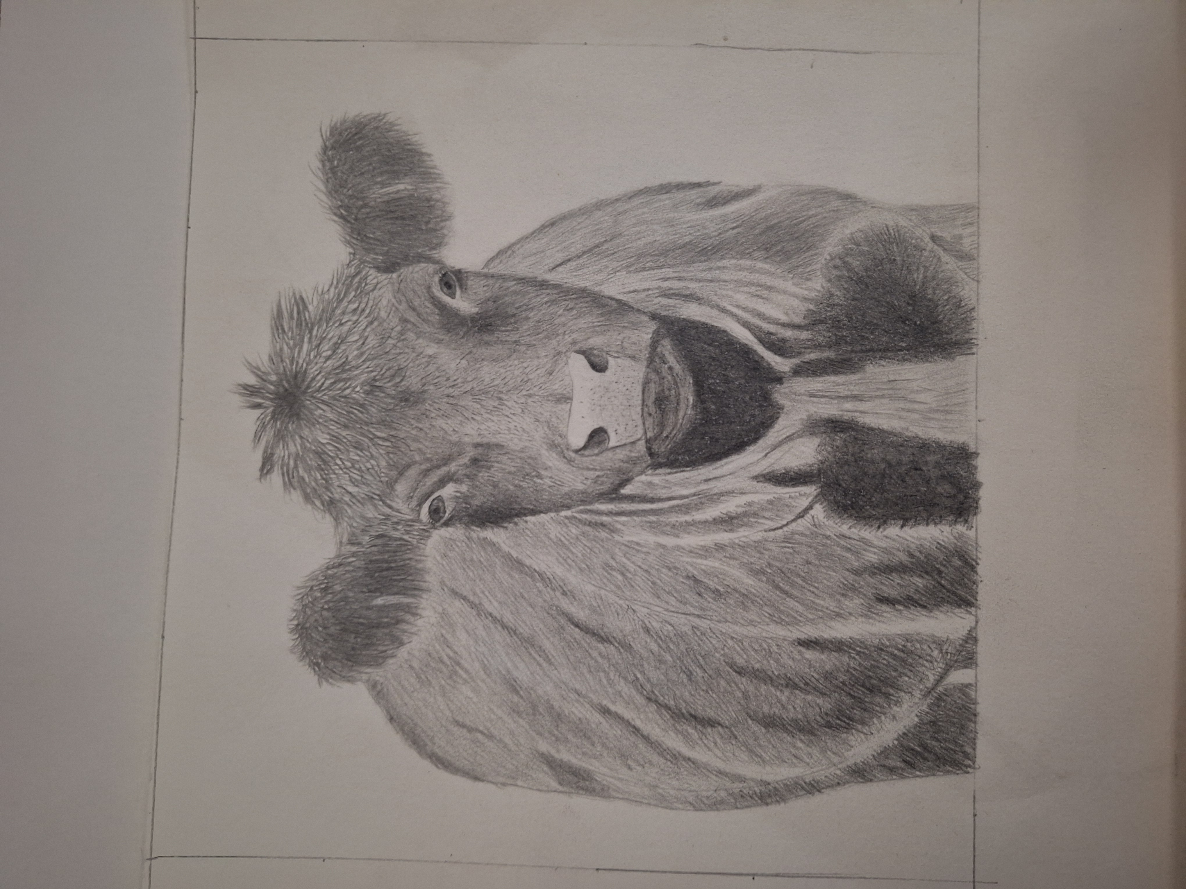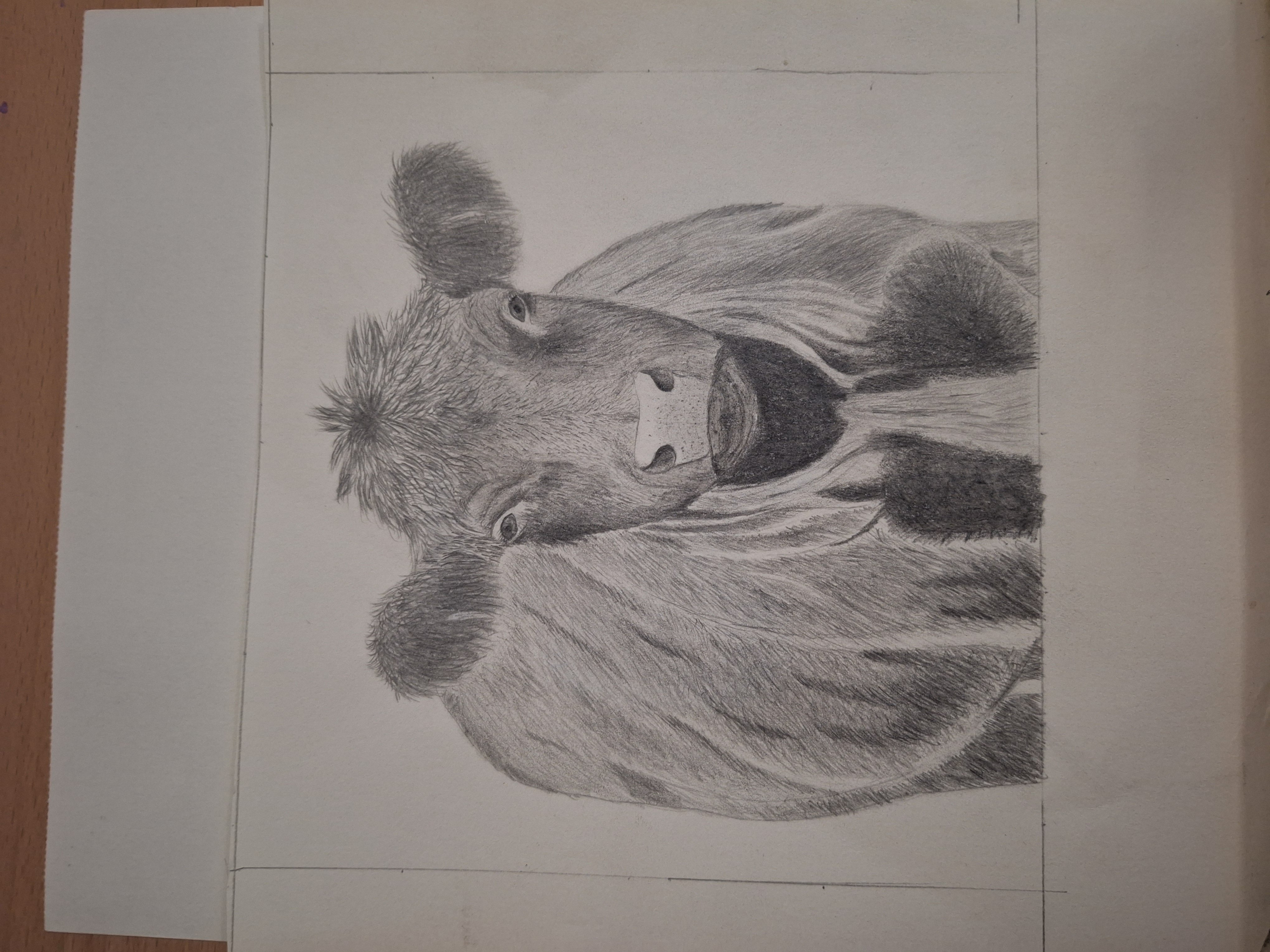 Bring the warmth of the countryside into your home with this beautiful original cow drawing. Every stroke of the graphite pencil shows the soft, shaggy coat and gentle eyes of this charming farm animal. This piece has a quiet, calm presence that would be perfect for a cozy living room, a rustic kitchen, or a child's bedroom. It's more than just a drawing—it's a moment of peace captured on paper.