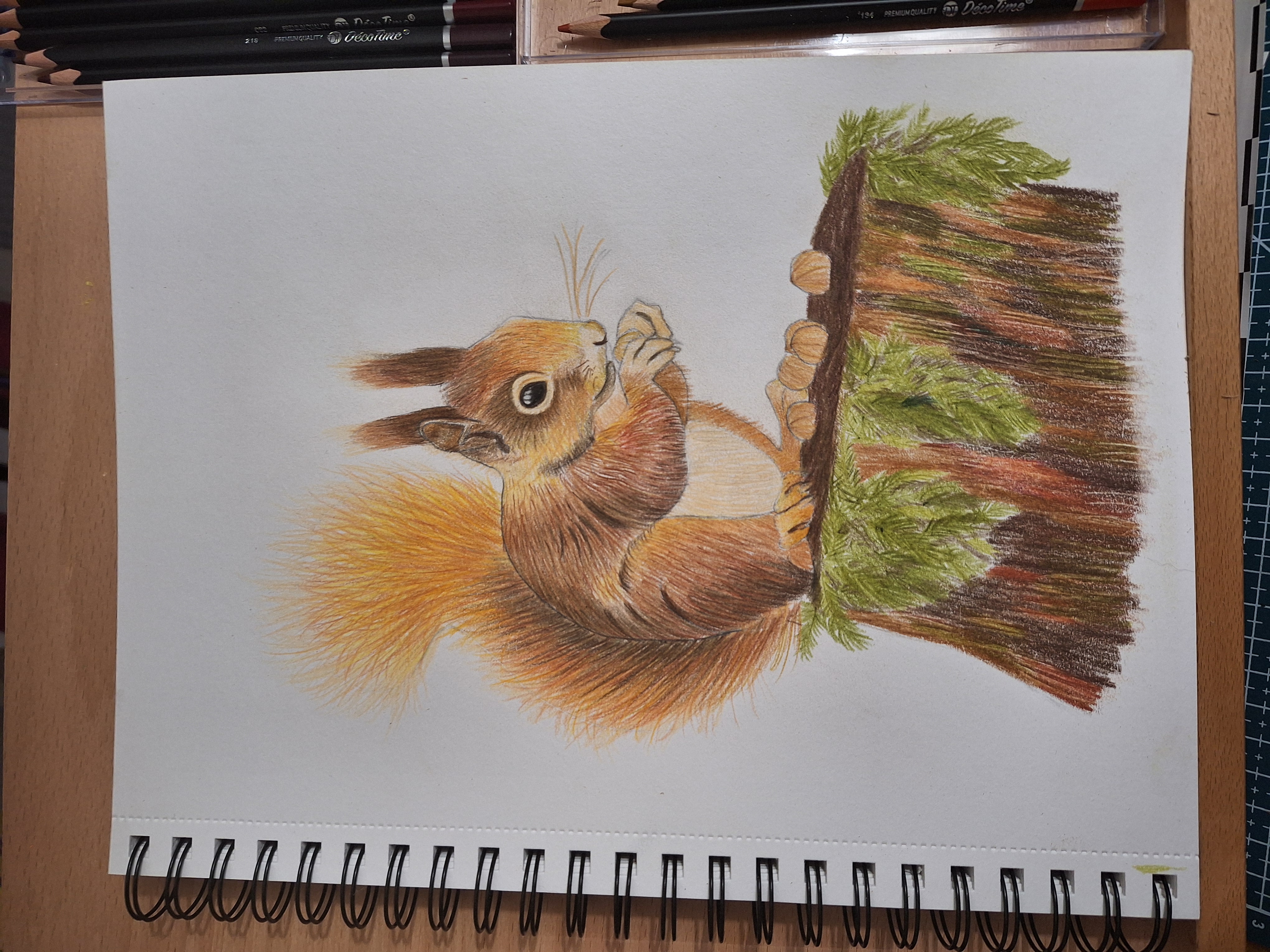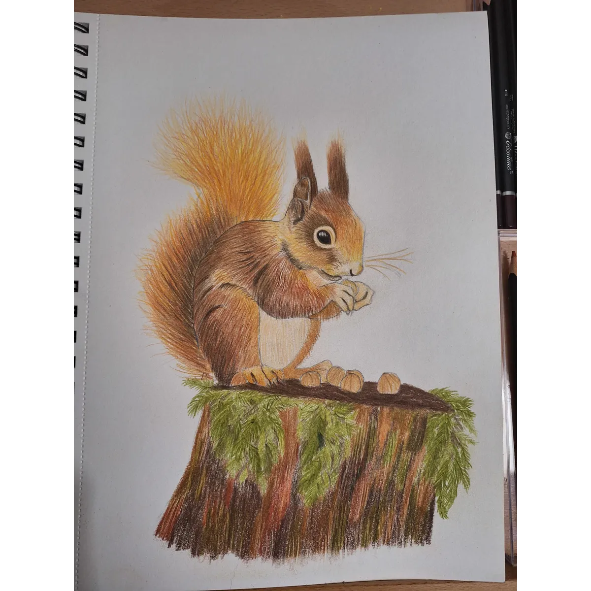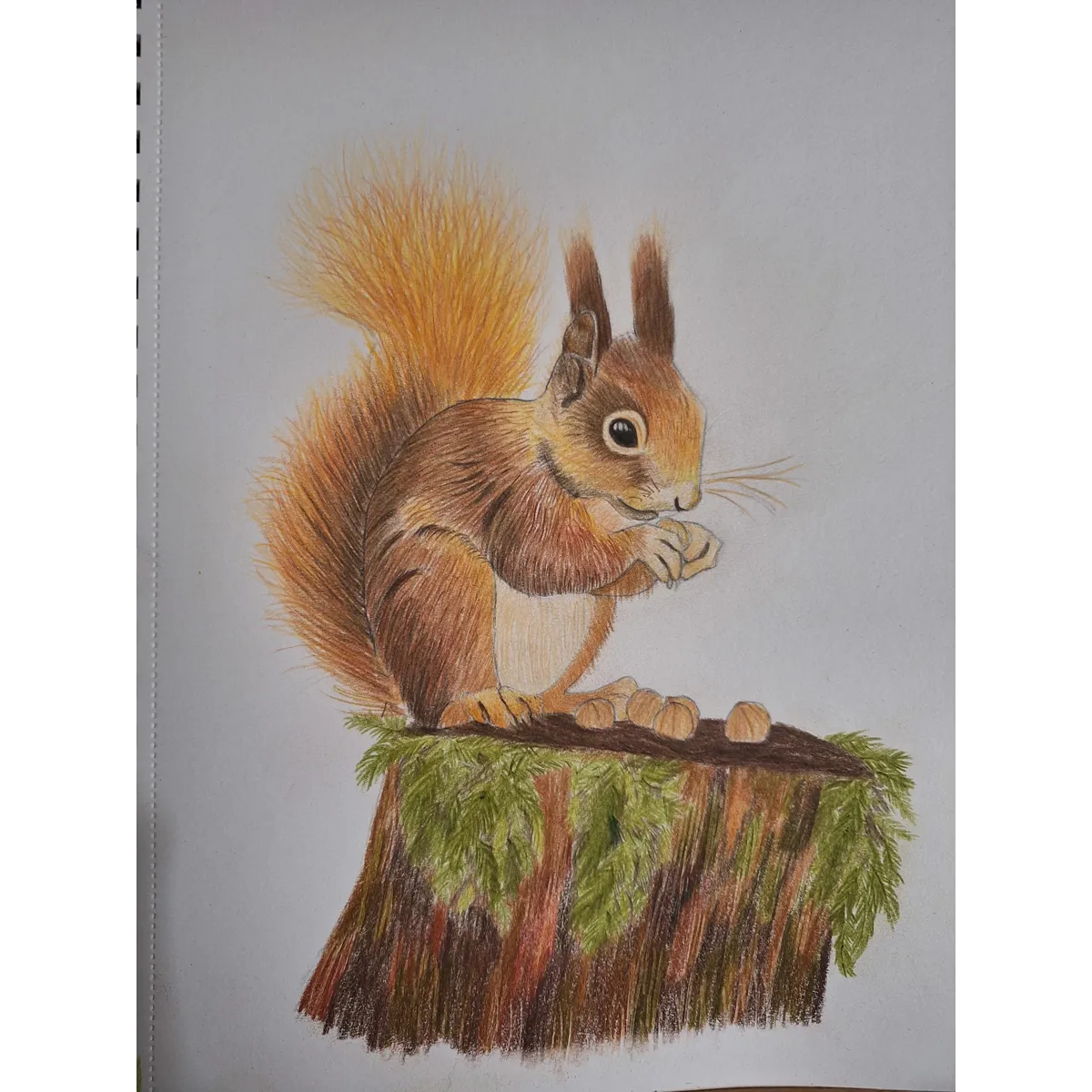 This is an exquisite art print of a red squirrel, captured in a serene moment as it holds a nut. The artist has used a warm, rich color palette to bring the squirrel's fluffy tail and delicate features to life, while the intricate details of the mossy tree stump add texture and depth. This print would be a beautiful focal point in a living room, study, or even a nursery. It’s ideal for anyone who appreciates the beauty of wildlife art.